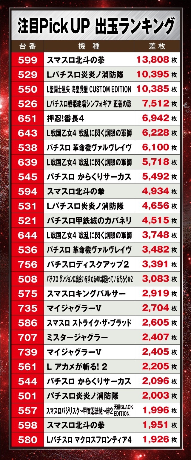 この日は、スロッターなら誰もが夢見る万枚超が続出する一日となった。なかでも出玉ランキング1位になった『スマスロ北斗の拳』では+13,808枚という圧倒的な記録を残している。