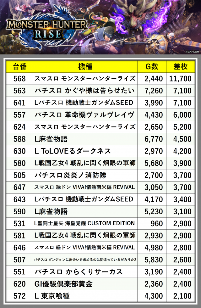 厳選された取材対象機種をはじめ、その他スロット全体から好記録が飛び出した!プレイヤーが楽しんだ1日を下記データにて振り返ってみて欲しい。