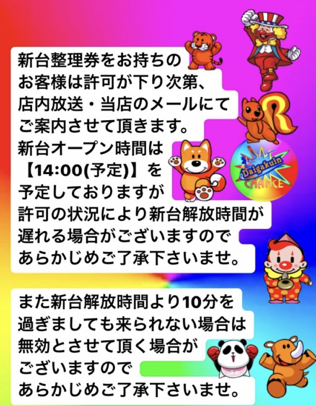 新台入替のお知らせ!新台抽選時間13時開放14時(予定)