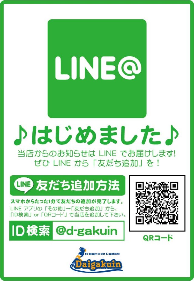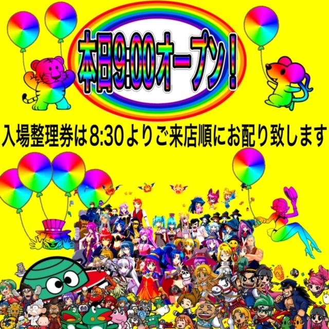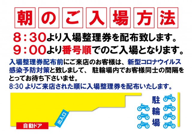 【整理券配布】AM8:30よりご来店順に入場整理券をお配り致します。(並ばずに駐輪場で間隔をとってお待ちくださいませ)【入場時間】AM9:00より入場整理券順にご入場となります。(入場整理券はパチンココーナー・パチスロコーナー共通です。) |