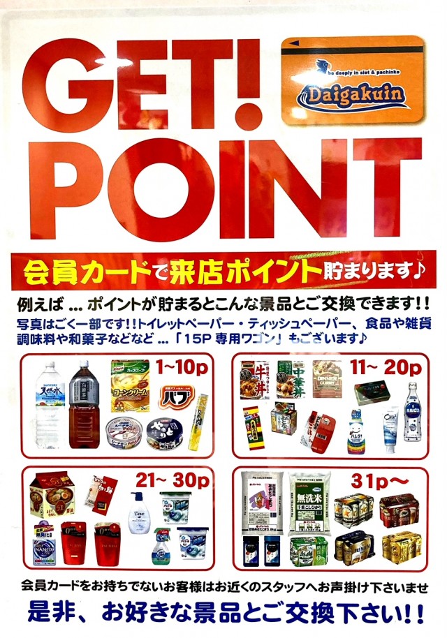 パチンコ大学院では地域1番のサービスでお客様をお出迎えさせて頂きます!来店ポイント景品100種類以上