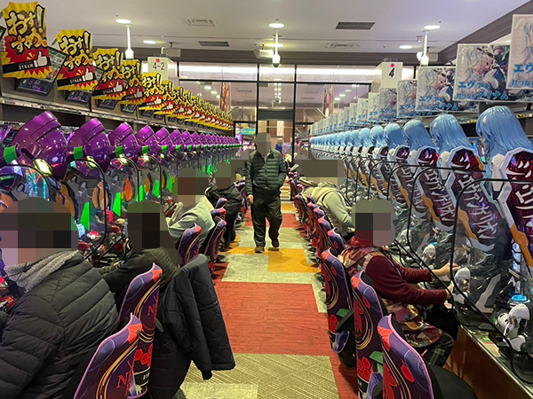 15時ごろの4円パチンコの様子を見ると「新世紀エヴァンゲリオン〜未来への咆哮〜」や「ぱちんこ シン・エヴァンゲリオン Type レイ」、「P大海物語5」が大盛り上がり。機種性能を存分に発揮するプレイヤーを目の当たりにしている。