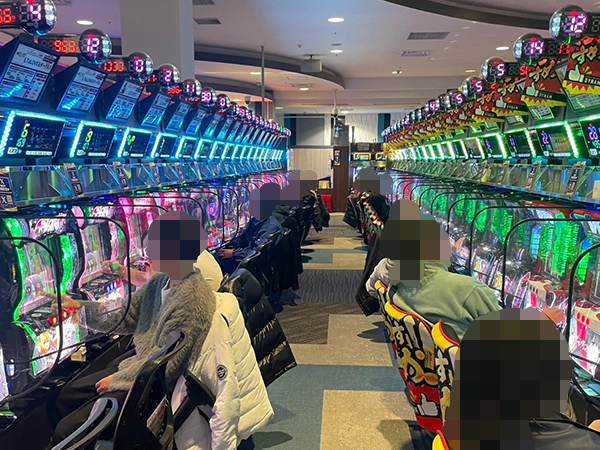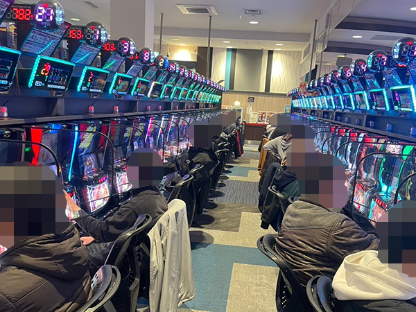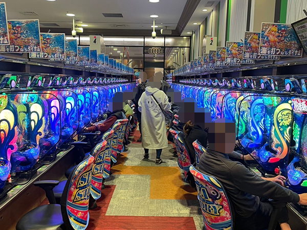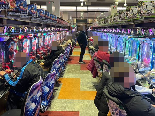 取材時は既に多くのプレイヤーが集結し、パチンコ・パチスロを問わずにぎやかな状況となっていた。