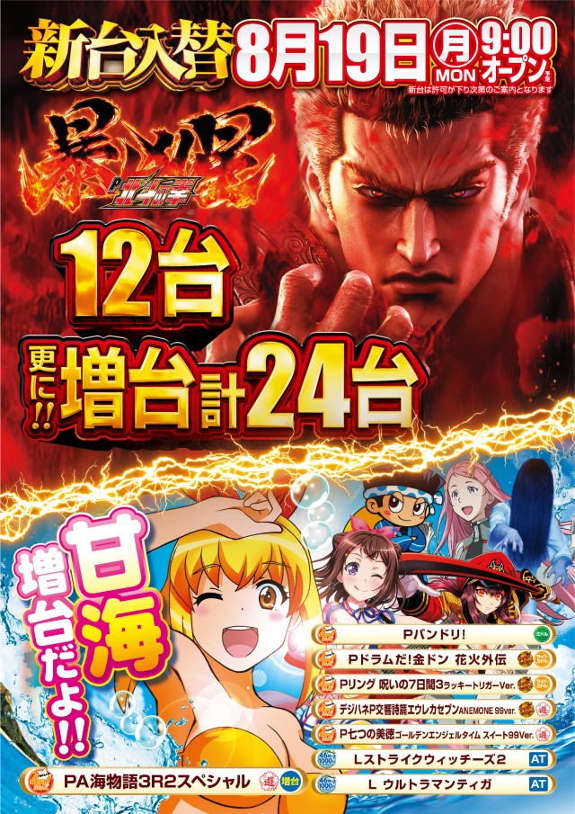 8月5日(月)新台入替9:00オープン
