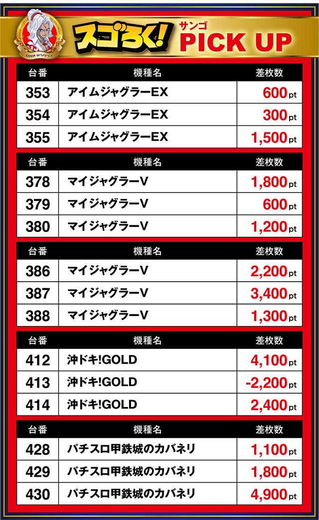 注目をした3台の結果をみると、どの台もプラス。355番台は1,500ptでこの日を終えたよ。