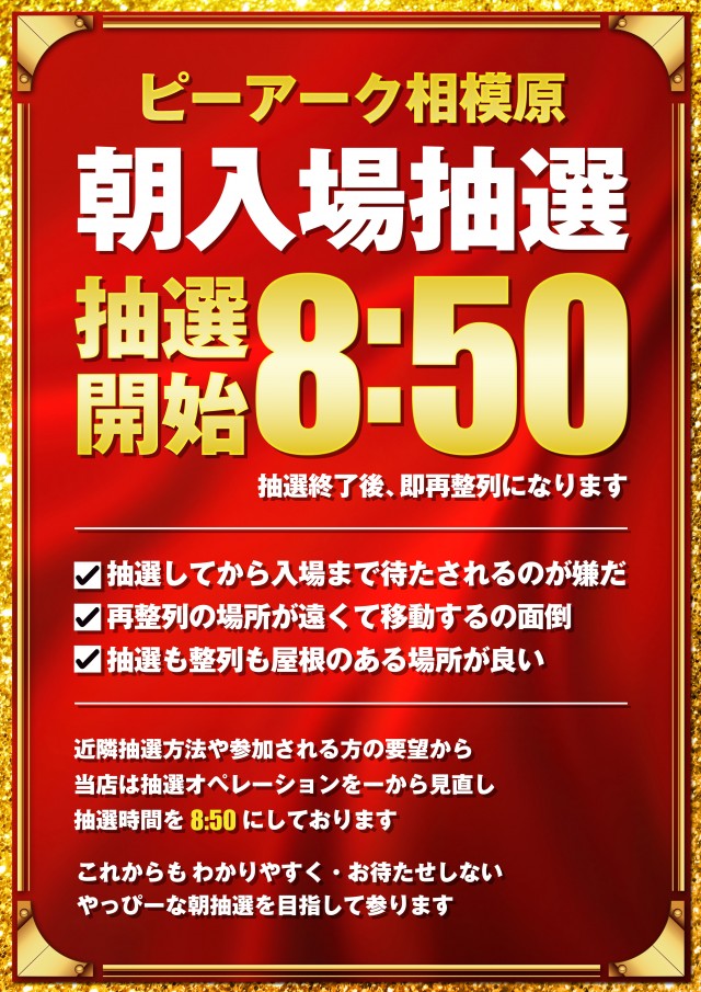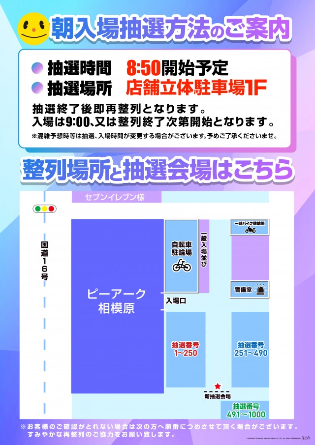 毎朝8:50に立体駐車場1Fで入場抽選を行います。 |