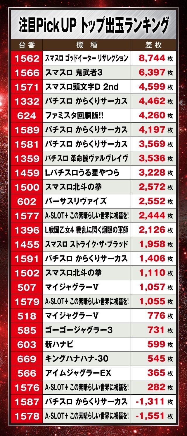 また、その他の機種で目立っていたのが『パチスロ からくりサーカス』で、+4,000枚超が2台に+3,000枚超が1台と複数の台が好成績を残しているだけに、ファンにとっては大満足の一日となっただろう。