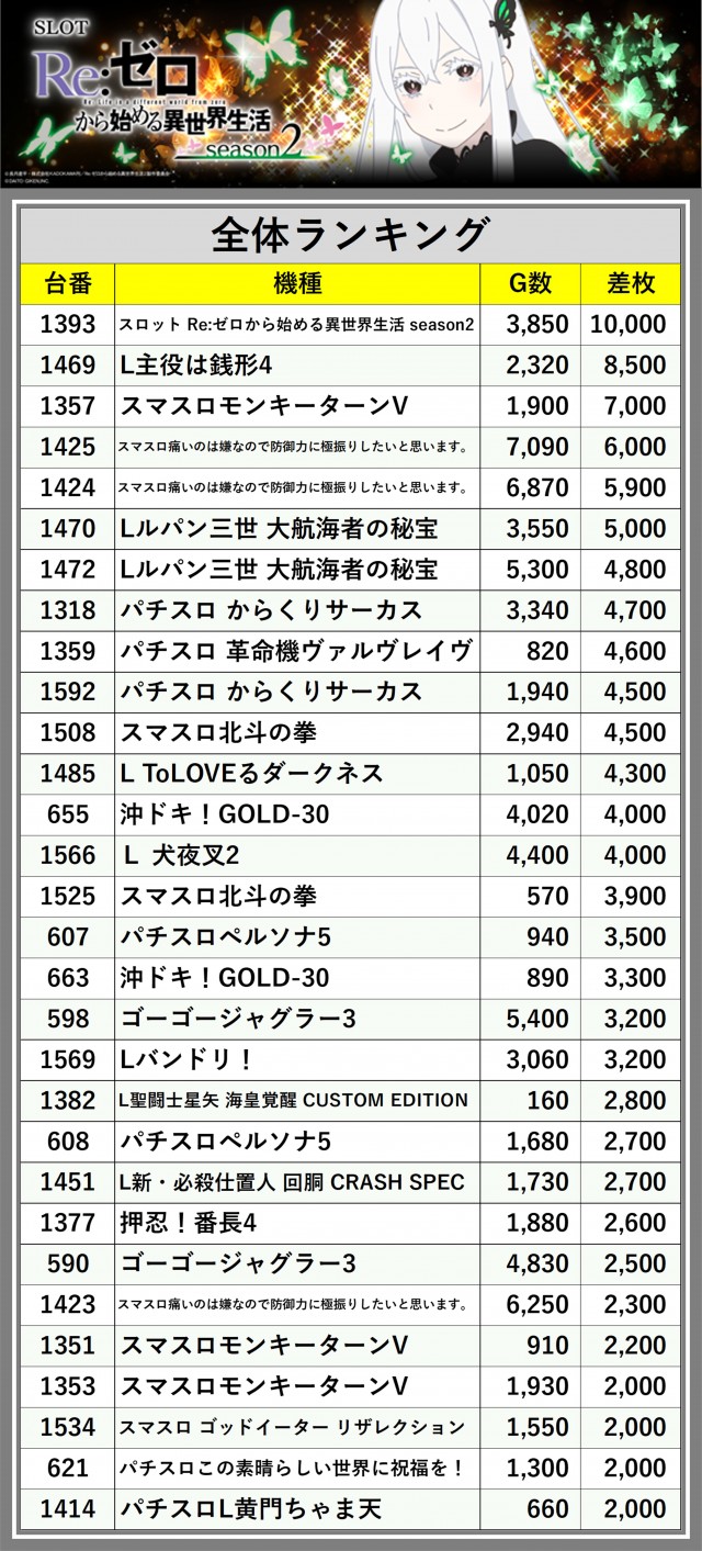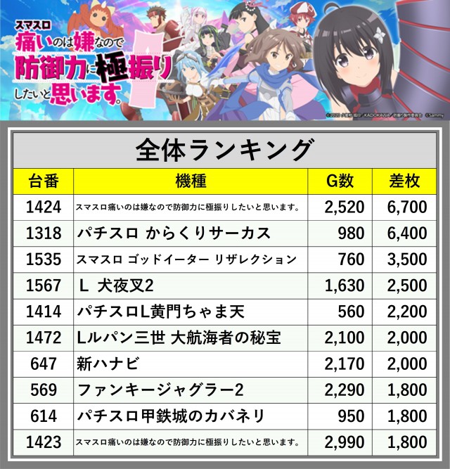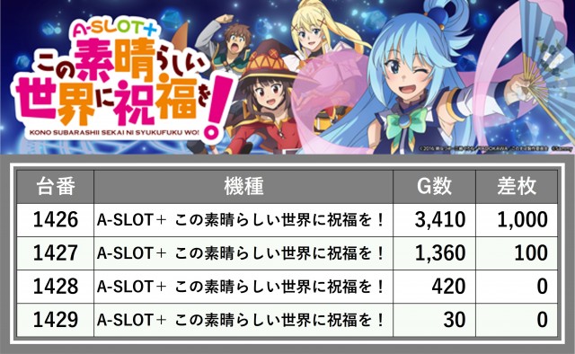 厳選された取材対象機種をはじめ、その他スロット全体から好記録が飛び出した!プレイヤーが楽しんだ1日を下記データにて振り返ってみて欲しい。
