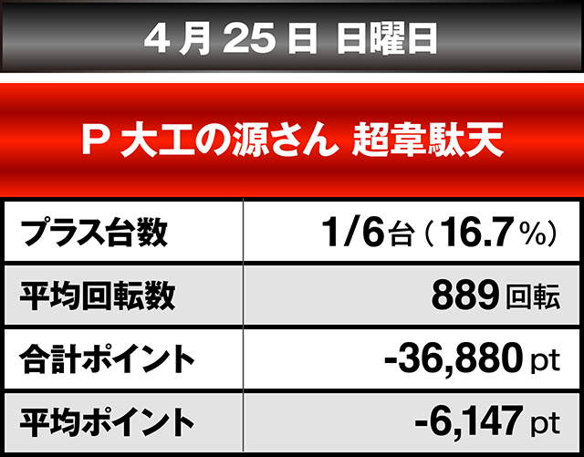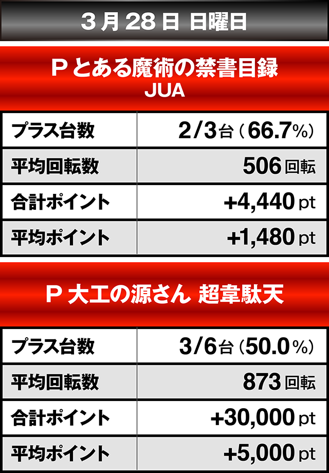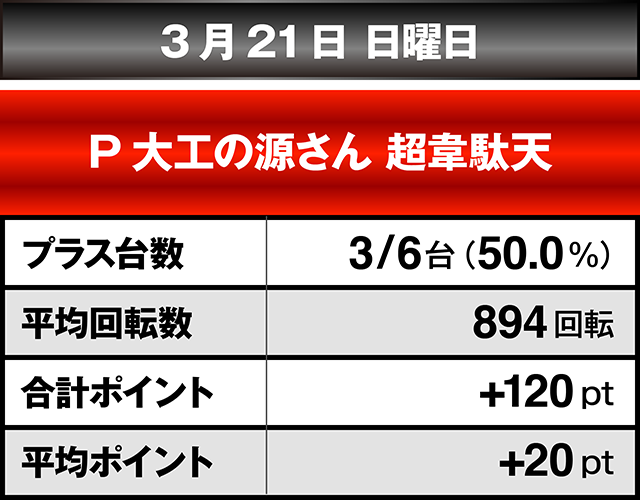 「P大工の源さん 超韋駄天」は、3月21日から3回連続でプラス割合が5割以上、最大でトータル50,000ptを超える日もあるなどボリュームのある結果を残した。