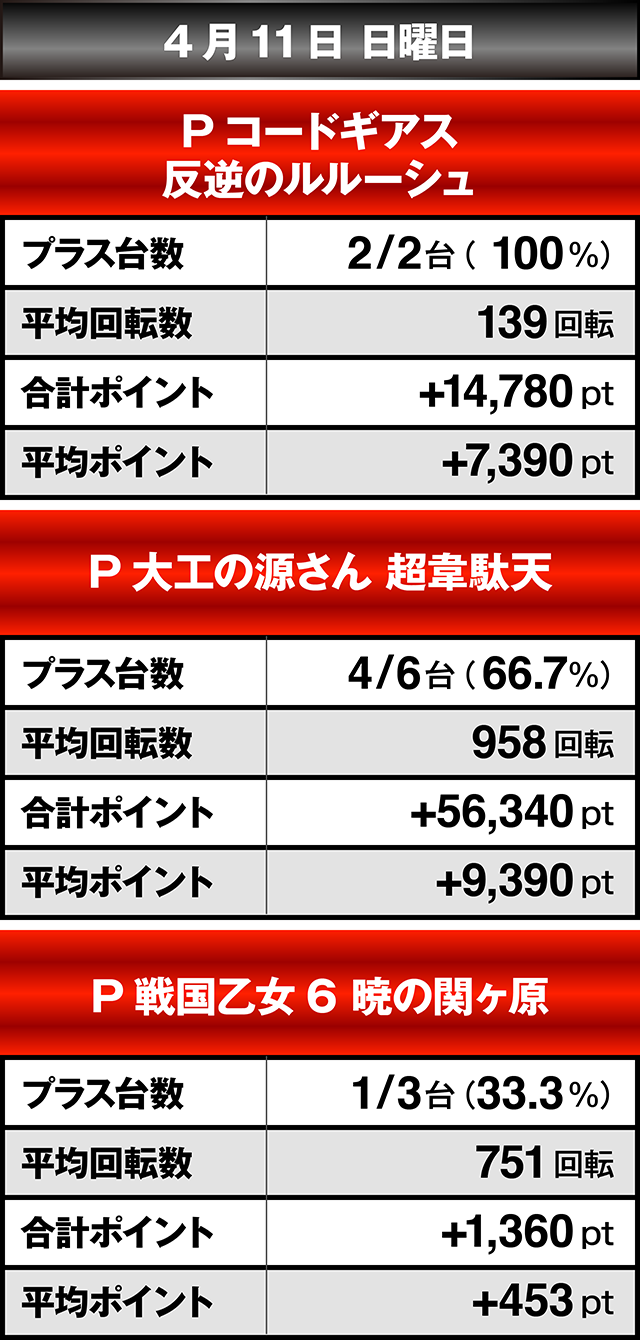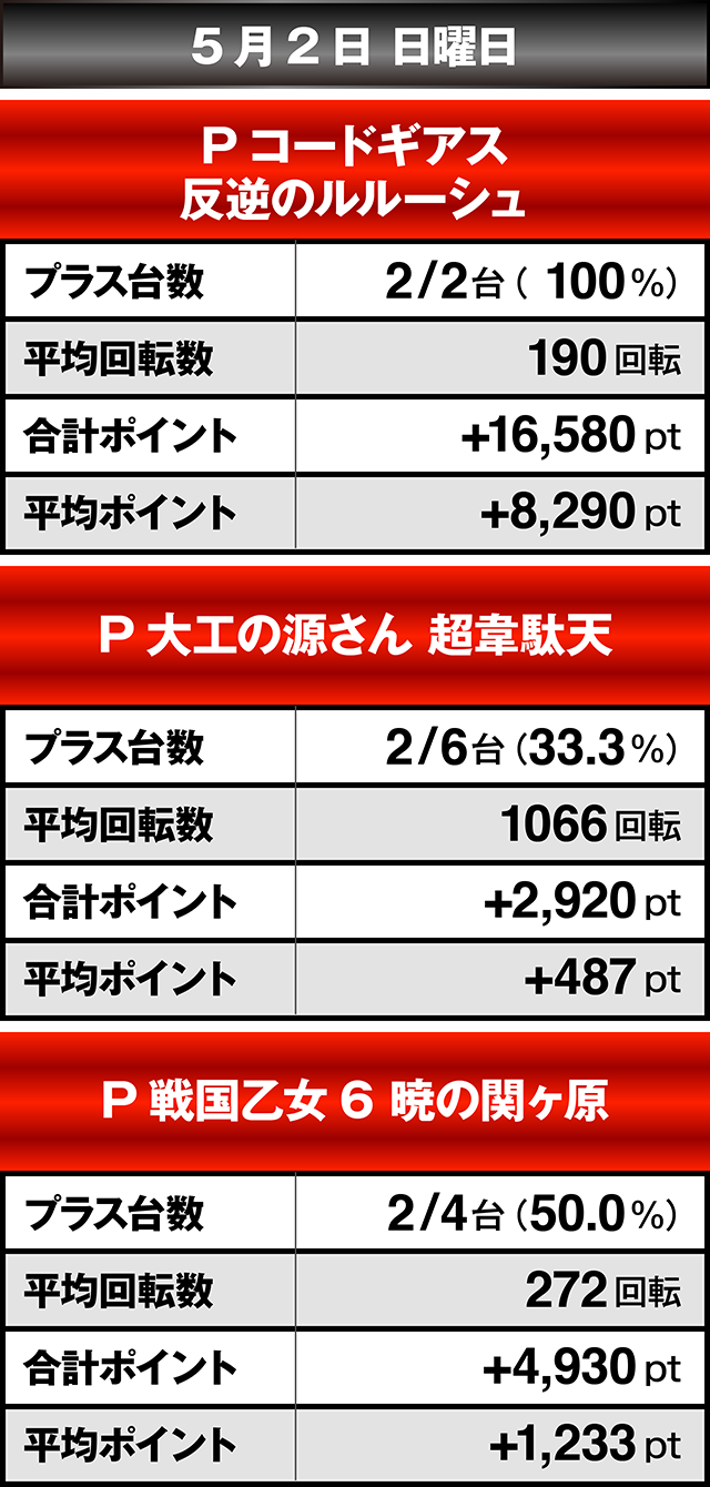 設置台数が2台の「Pコードギアス 反逆のルルーシュ」も注目すべき機種のひとつ。プラス割合100%、合計ポイント10,000pt超を2度記録した。