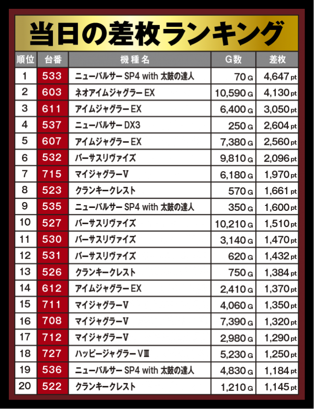 この日のSAPグループはひと味違う。DMMぱちタウンは、「SAP相模原」の特別なひとときを一斉取材した。特に華々しい活躍を残した機種たちをピックアップして紹介しよう。まずは差枚ランキングの発表だ!