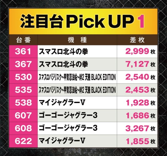 特に目立っていたのが『スマスロ北斗の拳』 。7,000枚オーバーと機種のポテンシャルを上手く引き出している。ほかにも『スマスロバジリスク~甲賀忍法帖~絆2 天膳 BLACK EDITION』や『ゴーゴージャグラー3』など、あちこちで好調台の見事な活躍が見られ、微笑ましいムードに包まれていた。