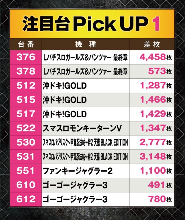 『沖ドキ!GOLD』『スマスロバジリスク~甲賀忍法帖~絆2 天膳 BLACK EDITION』ジャグラーシリーズなど、様々な機種から好調台が誕生していたようだ。