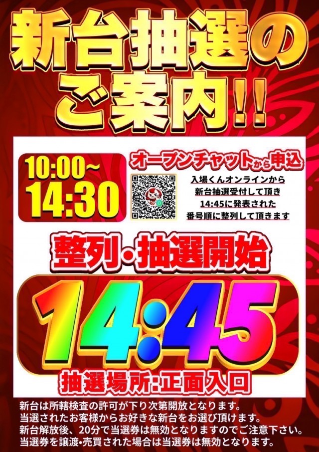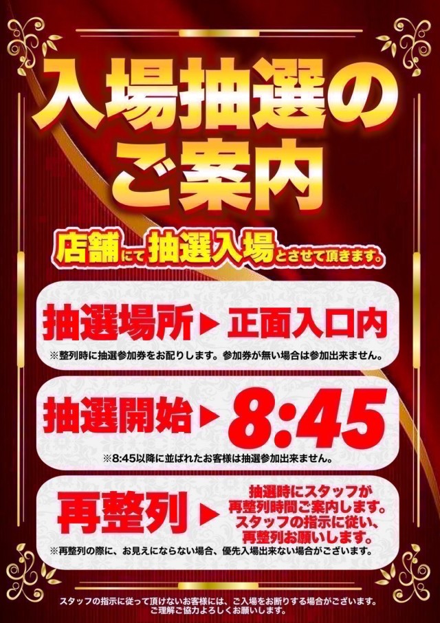 抽選場所→ 正面入り口 抽選時間→ 8:45 再整列→抽選後にスタッフからご案内させて頂きます。(混雑が予想される場合は抽選時間の変更がございます。詳細は店舗にてご案内しております) |
