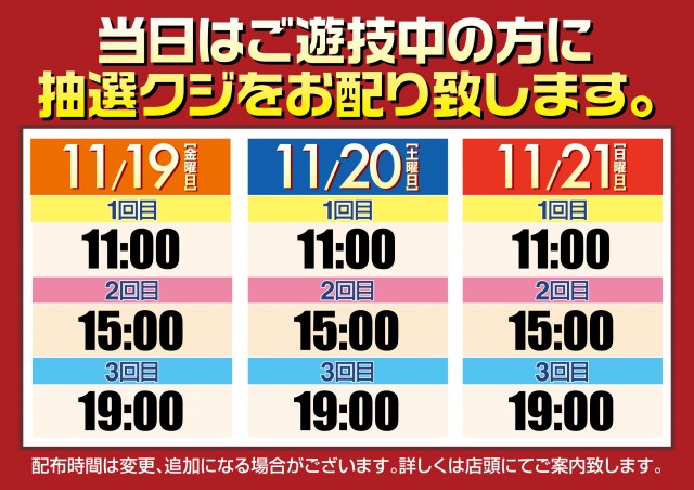 抽選場所→ 正面入り口 抽選時間→ 8:45 再整列→抽選後にスタッフからご案内させて頂きます。(混雑が予想される場合は抽選時間の変更がございます。詳細は店舗にてご案内しております) |