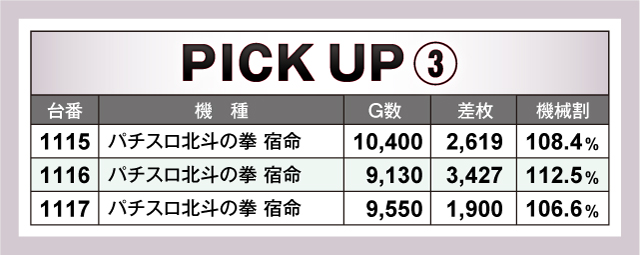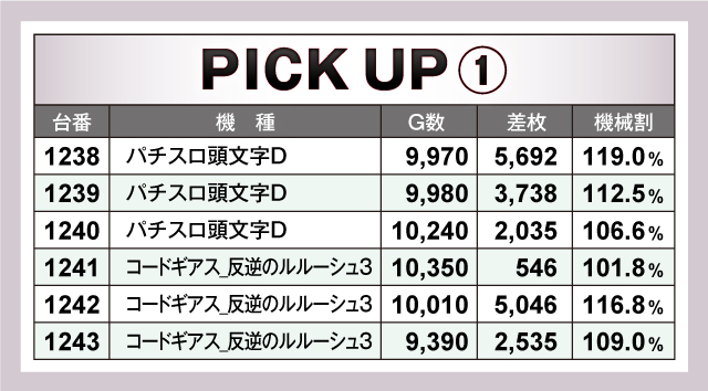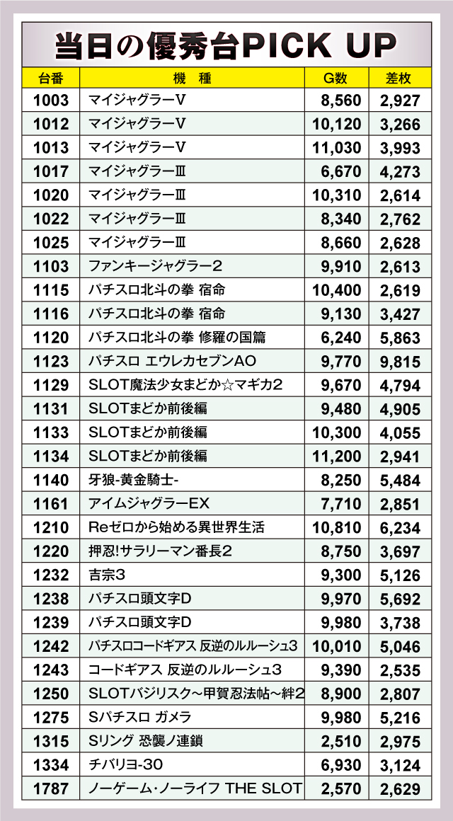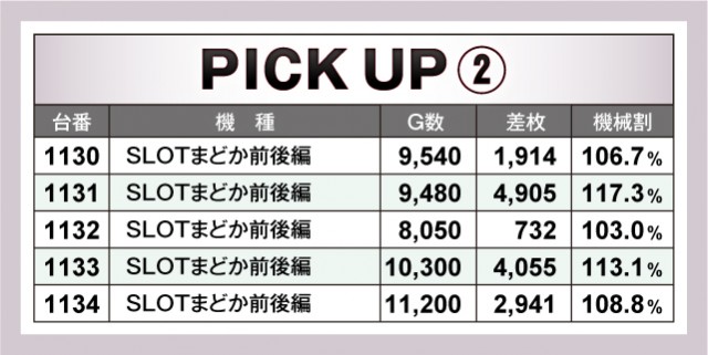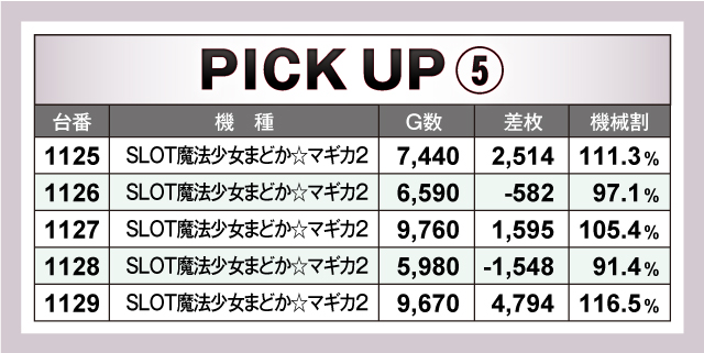 ピックアップ機種では、既出の機種に加え、『パチスロコードギアス 反逆のルルーシュ3』、『SLOT劇場版 魔法少女まどか☆マギカ[前編]始まりの物語/[後編]永遠の物語』、『パチスロ北斗の拳 宿命』、『SLOT魔法少女まどか☆マギカ2』が盛り上がりを見せていた。特に『まどか前後編』はピックアップした6台すべてがプラスで、稼働もすべて8,000G以上、+4,000枚級が2台もあるなど、極めて優秀な成績を収めた。