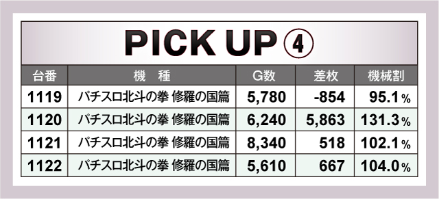 優秀台では、+9,815枚を叩き出した『パチスロエウレカセブンAO』の1123番台を筆頭に、+6,234枚の『Re:ゼロから始める異世界生活』の1210番台、+5,863枚の『パチスロ北斗の拳 修羅の国篇』の1120番台、+5,692枚の『パチスロ頭文字D』の1238番台と続く。また、稼働が素晴らしく、優秀台の中だけでも、10,000Gオーバーの台が8台もあったほどだ。