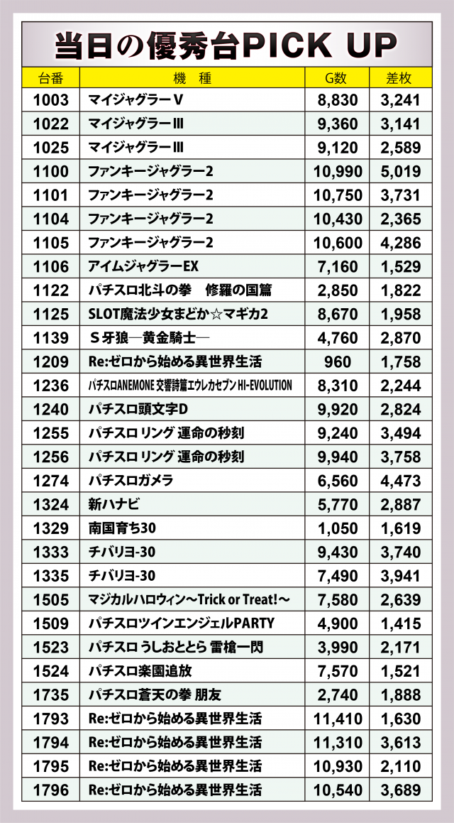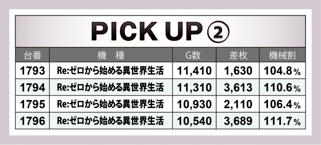 またこの日は『ファンキージャグラー2』『Re:ゼロから始める異世界生活』の2機種が横並びで好況。前者は3台全てがプラスで差枚数+7千6百枚超、後者は4台全てがプラスで差枚数+1万1千枚近くとなった。