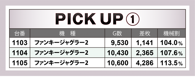 では当日の優秀30台PICK UPのチェックから。後述する横並び好況スポット以外で注目したいのが『パチスロ リング 運命の秒刻』『チバリヨ-30』の2機種。どちらもプラス2台で差枚数7千枚突破を記録。その他では、マイジャグラーシリーズが好成績を収めた。