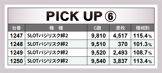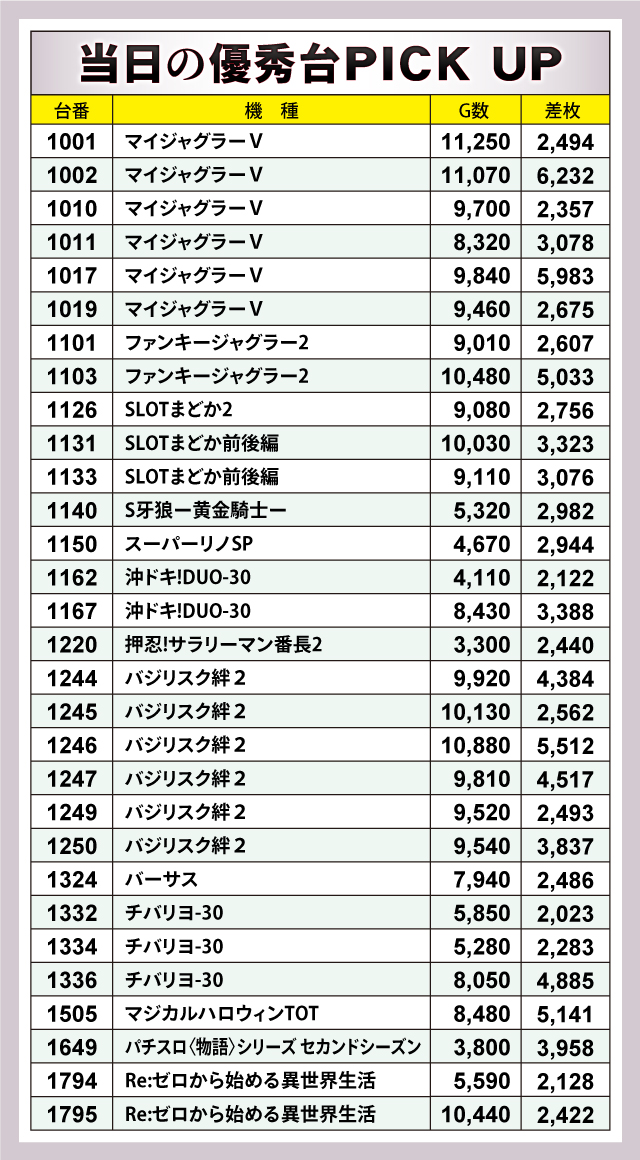 優秀台として、まず目をひいたのが『マイジャグラーⅤ』。差枚+6,232枚、G数11,070Gの1002番台を筆頭に、+5,983枚の1017番台、+3,078枚の1011番台など大幅プラス台がズラリ。これにひけを取らなかったのが『SLOTバジリスク〜甲賀忍法帖〜絆2』。こちらも、+5,512枚で10,880Gを記録した1246番台、+4,517枚の1247番台など優秀台がゴロゴロしていた。その他、+5,141枚の『マジカルハロウィン〜Trick or Treat!』1505番台、+5,033枚の『ファンキージャグラー2』1103番台などが大きな盛り上がりを見せていた。