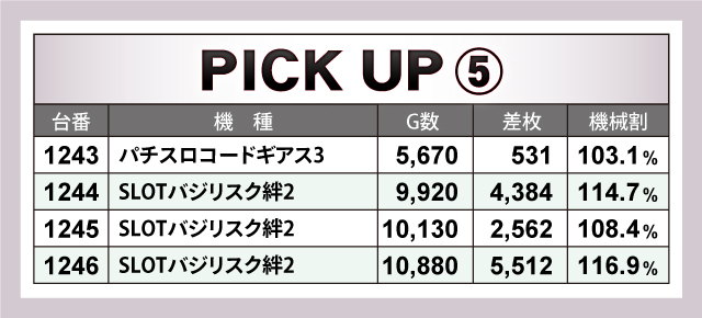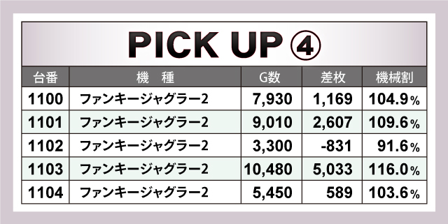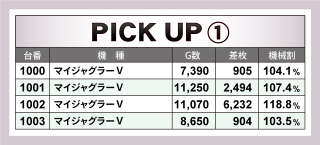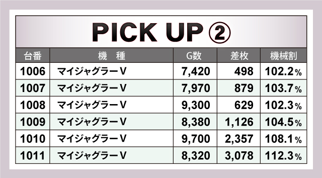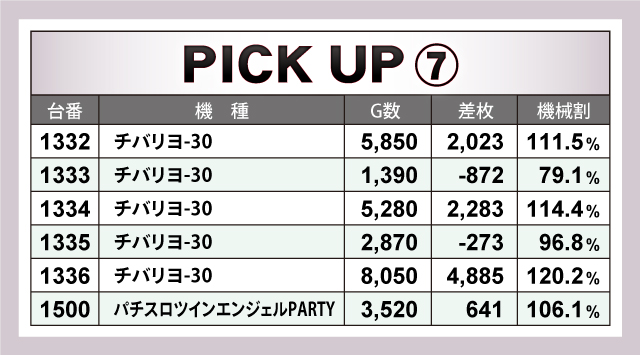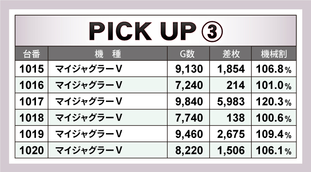 ピックアップ機種は、『マイジャグラーⅤ』、『ファンキージャグラー2』、『チバリヨ-30』が特に目立っていた。