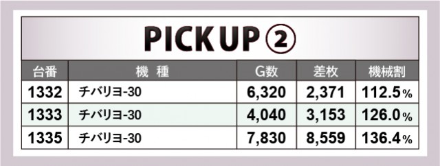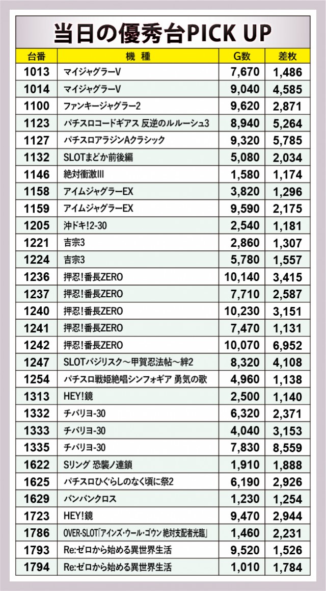 以上の機種から+5千枚オーバーが発生しており、店内の盛り上がりをリードした存在となったようだ。惜しくも大台を突破できなかった機種も見られるが、全体的に熱気を感じられる雰囲気だったのが伝わってくる。『ジャグラー』シリーズを筆頭としたノーマル機、『押忍!番長ZERO』ら人気AT機だけでなく、『チバリヨ-30』のような沖スロも活躍していたのは、同店の並々ならぬ気合いを窺えた。
