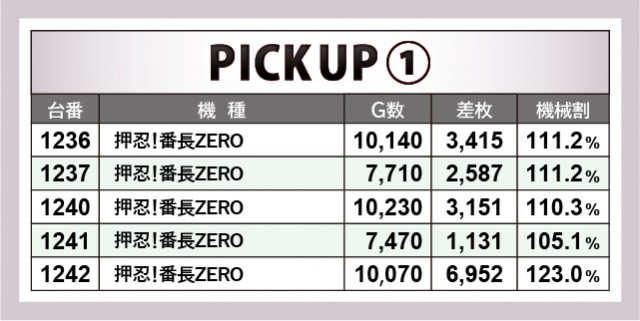 人気シリーズの最新機『押忍!番長ZERO』では1242番台の+6,952枚が先頭に立ち、1236番台の+3,415枚・1240番台の+3,151枚など好記録が続出していた。朝から即満席となる人気ぶりで、足繫く通うファンたちは同機種に対して相当な信頼を寄せているのだろう。しっかりと結果で応えており、触れることができたファンたちは充実のひと時を送れたのではないだろうか。