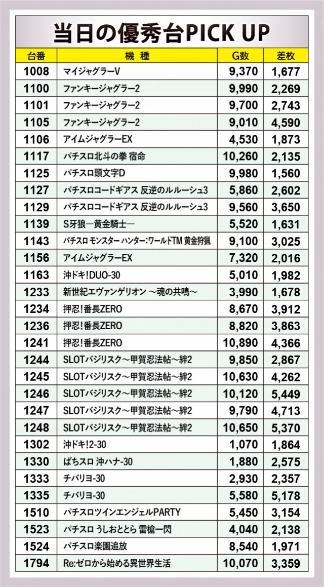 多種多様な機種が優秀台としてピックアップされているが、『チバリヨ-30』1335番台の+5,178枚を筆頭に沖スロの活躍が目立っていた。もちろん『押忍!番長ZERO』『パチスロコードギアス 反逆のルルーシュ3』といったAT機も熱気を放っており、館内全体が大きく賑わっていた様子が窺える。お気に入りの機種で有意義なひと時を過ごせたファンは、「ジャパンニューアルファ テームズ」の実力を肌で感じ取ったはずだ。