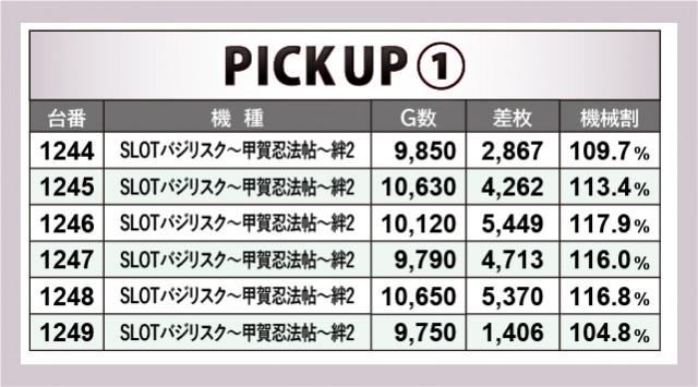絶大な人気を誇る『SLOTバジリスク~甲賀忍法帖~絆2』からは、1246番台と1248番台で5千枚オーバーが発生!また上表をご覧の通り、横並びで好記録が続出しているため、まとまりのある出玉感で誰もが好感触を掴んでいたはずだ。10,000回転以上を回す台が複数見られた点からも、笑顔になれる状況が整っていたのは間違いない。