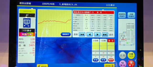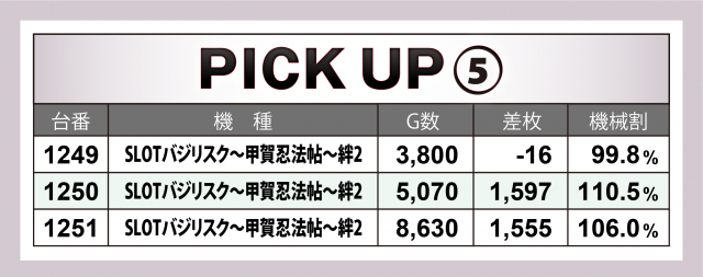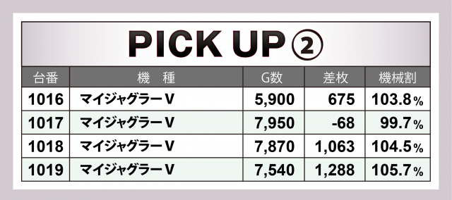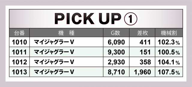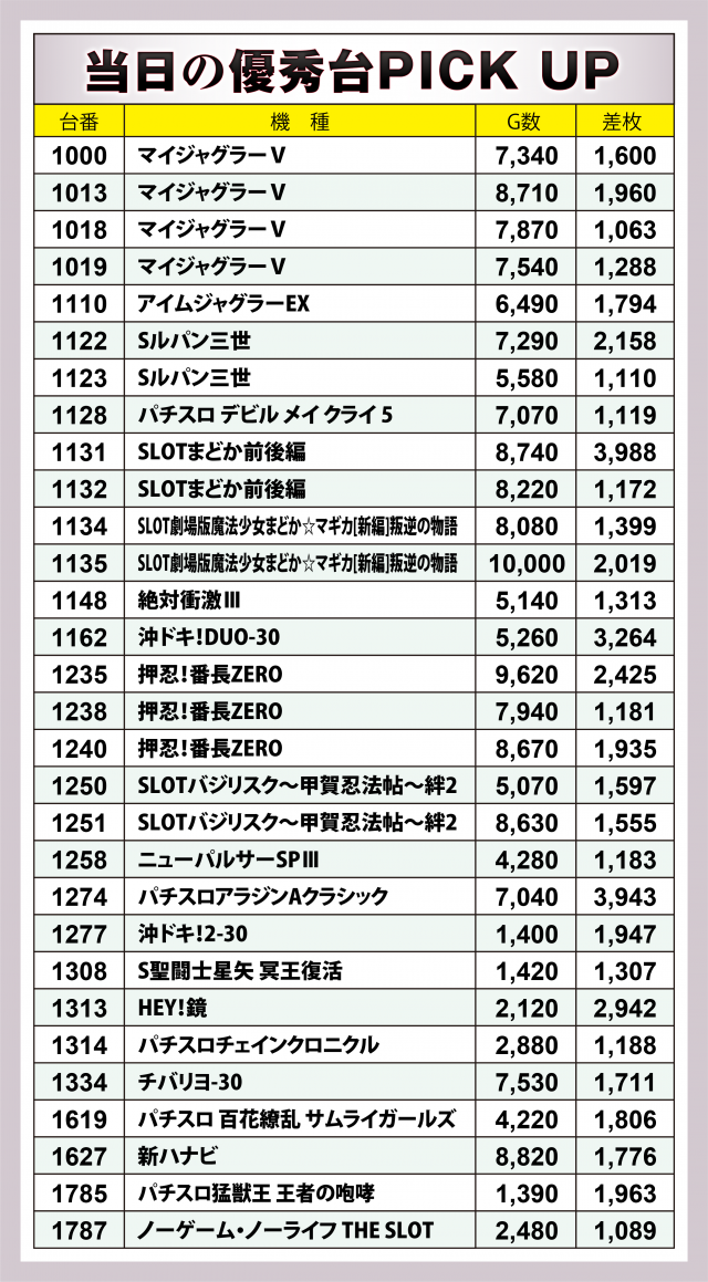 まずは当日の優秀30台のPICK UPから。後述する横並び好況スポット以外では『沖ドキ!DUO-30』『沖ドキ!2-30』『チバリヨ-30』といった30パイマシンの好調が目立つ他、『パチスロアラジンAクラシック』が差枚数+3千枚を突破していた。また取材日に導入間もない『Sルパン三世』も設置2台がどちらもプラスとなった。