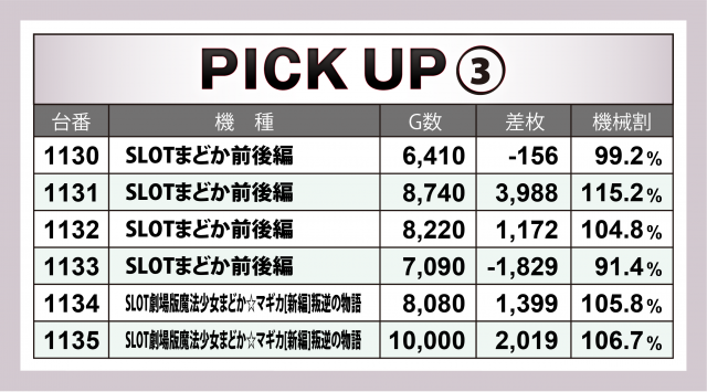 さらに、この日は5機種5か所20台の横並び好況スポットが出現。マイナス台も少ない中、最も好成績だったのが『SLOT劇場版 魔法少女まどか☆マギカ[前編]始まりの物語/[後編]永遠の物語』『SLOT劇場版魔法少女まどか☆マギカ[新編]叛逆の物語』の2機種6台。+4千枚弱の台を筆頭に、全台トータルで+6千枚を記録!