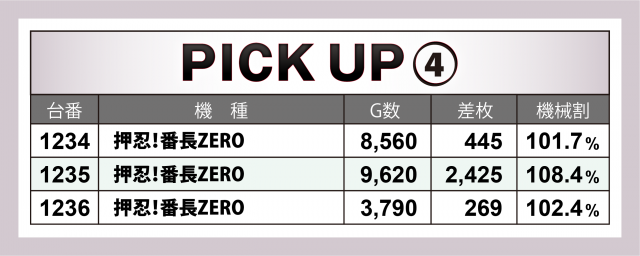 今回は[1,000円/46.04枚] スロ全体で+1,204枚の差枚数プラスを達成。正直言って少なめではあるが前回敗北の借りを返した形となった。とは言え、評価ptも低めなのは今後解消していきたいところ。また、優秀30台PICK UPの表を見てお分かりの通りゲーム数が低い台もかなり見られた点はいただけない。今取材に挑む勇者たちには、粘り腰で戦う姿勢を是非とも見せてもらいたい。