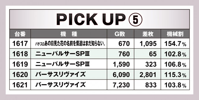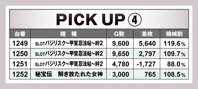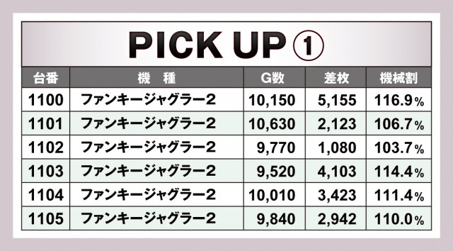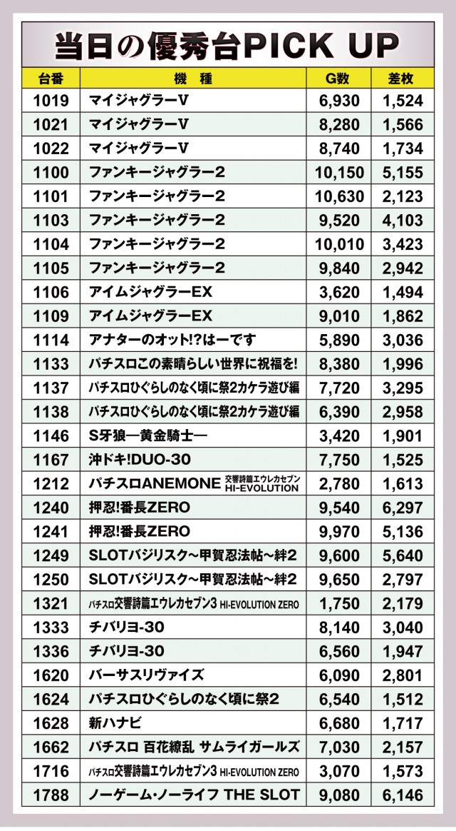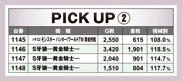 今回のピックアップでとりわけ目立っているのが『ファンキージャグラー2』だろう。「ファンキー」は6台設置なのだが、全台プラスかつ1万ゲーム前後回されているところを見ると、まさに全台系と言えよう。その他、「モンハン黄金狩猟」と「牙狼」の黄金繋がりや「ニューパル」と「バーサス」のボーナスタイプ並びなどTOP30以外でも見所あり。回されていない台もあったので埋もれてしまった高設定の可能性もありそうだ。