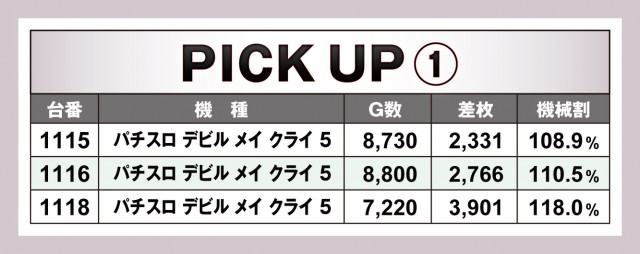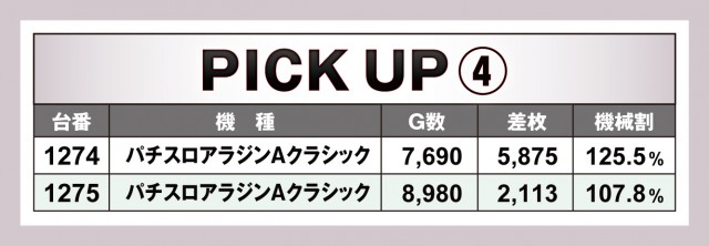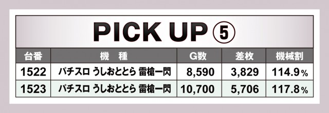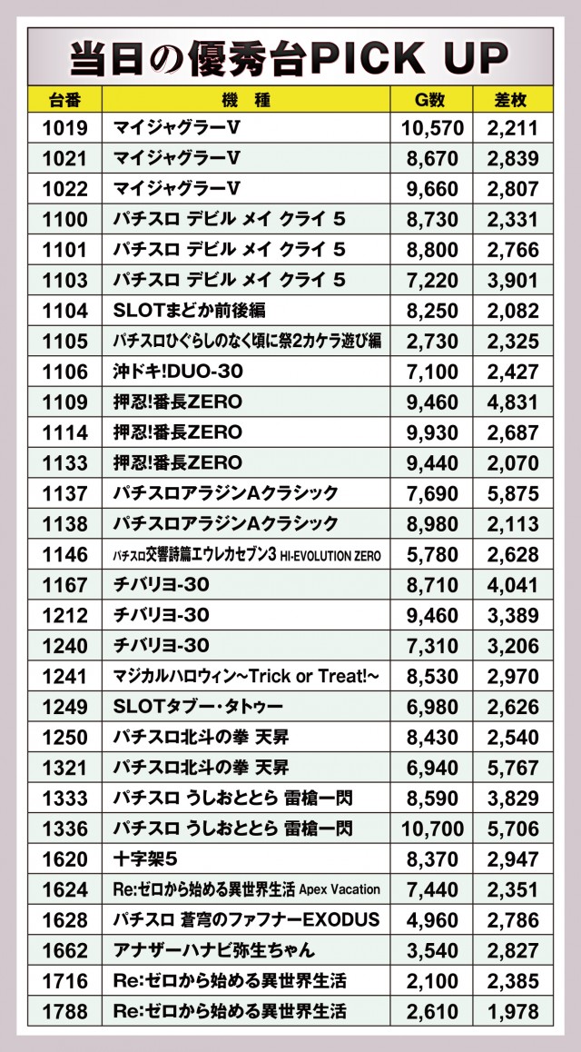 ピックアップは5つ! 先述した機種以外でかなりの差枚数を叩き出しているのが『パチスロ デビル メイ クライ5』『パチスロアラジンAクラシック』『パチスロ うしおととら 雷槍一閃』。いずれもホームラン級の出玉が飛び出ており、しかも隣同士となれば並んで高設定があった可能性が高い! AT機の高設定はヒキが伴えばやはりそれ相応の結果が出るということか。