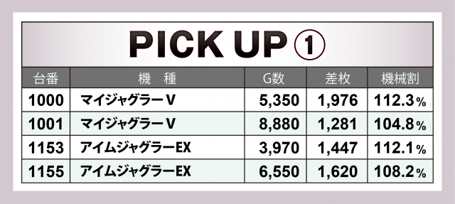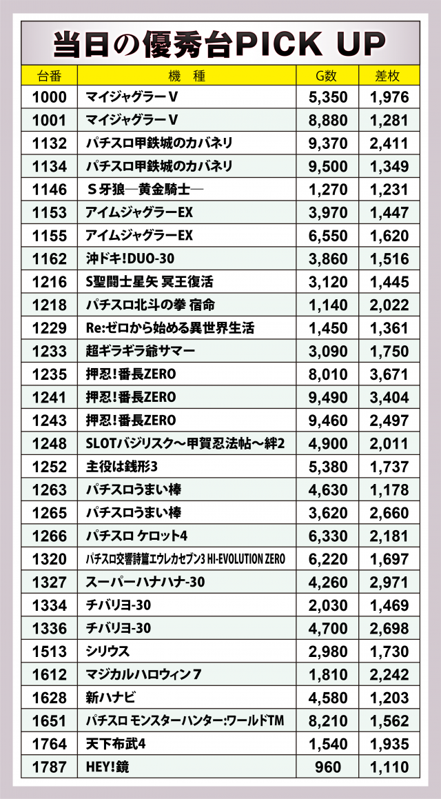 まずは優秀30台のPICK UPから。差枚数+2千枚以上は11台となり、後述する好調5機種以外では取材日に新台導入間もなかった『パチスロ甲鉄城のカバネリ』の好記録が目立った。