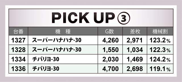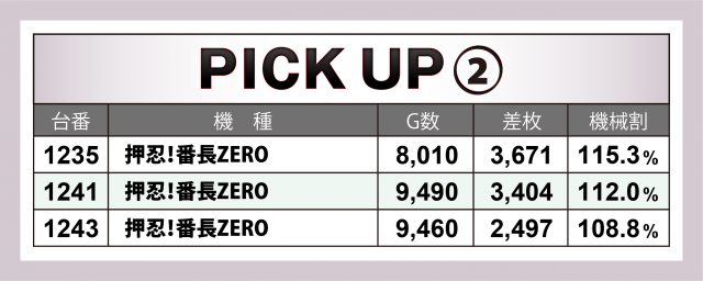 続いてはこの日好調だった5機種。なんと言っても注目は『押忍!番長ZERO』。3台の平均が+3千枚超となる高水準の結果となった。その他、30パイマシン2機種でも+3千枚に迫る勢いの台を輩出!
