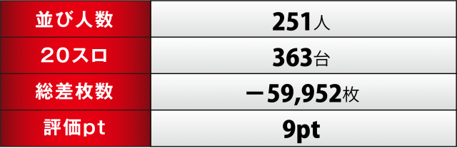 今回、[21.72]スロ全台トータルの差枚数マイナスに終わり、「英雄」取材の連勝は5でストップ。それよりもさらに気掛かりなのは過去取材から段々と評価ptが減少していること。次回の取材時にはトータルプラスと共に圧倒的なポイント数の高さで今回の借りを返して欲しい!