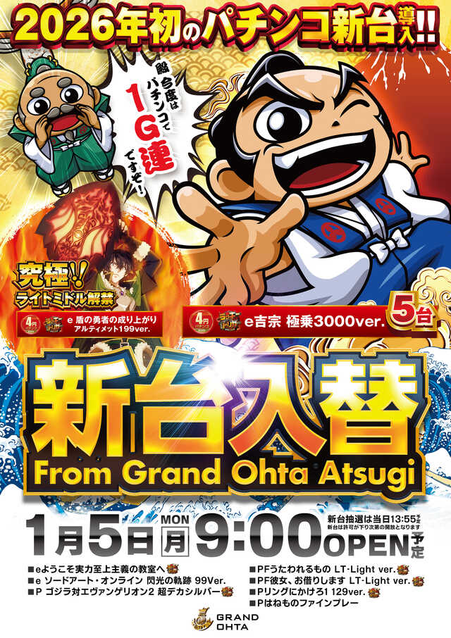 12月10日(日)グランドオータ厚木店 様こんにちは(●^3^●)ノシぱちタウン編集部です!本日はグランドオータ厚木店 様に登場ヽ(・ω・)ノ=3こちらではパチンコ468台✿パチスロ366台☆合計834台☆をご用意いたしております♪今回のぱち…