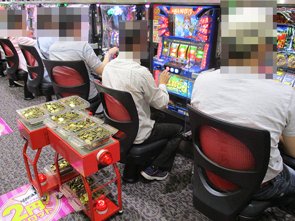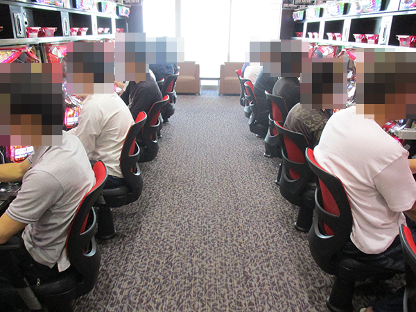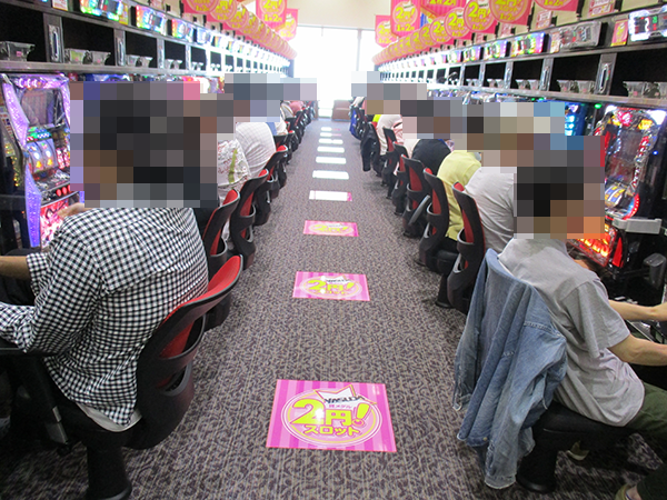 38台設置されている2円パチスロはすべての台が埋まり、朝から大きな賑わいをみせていた。