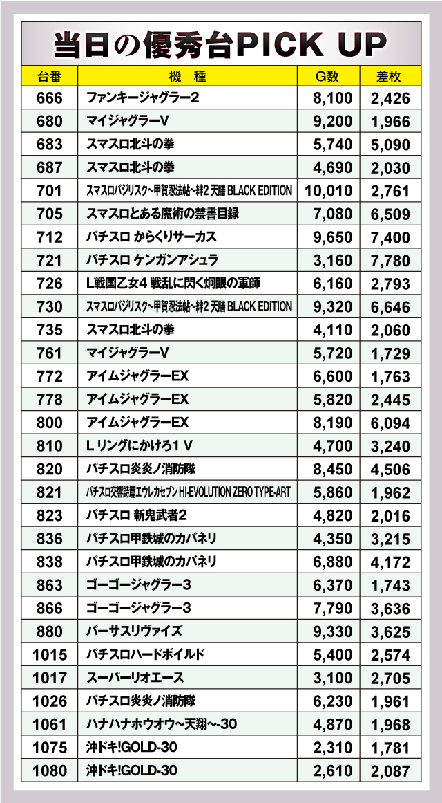 まずは優秀台30台の紹介から。30台のうち22台が+2,000枚オーバーで、+3,000枚オーバーは12台。そして+5,000枚オーバーは6台と、小規模ホールながらビッグな結果が続出。それらのなかでもっとも優秀だったのは、721番台の「パチスロ ケンガンアシュラ」で差枚+7,780枚を獲得! 30台全体を見渡すと、スマスロからノーマルタイプまで幅広い機種がランクインしていることから、チャンスはいたるところに隠されていた可能性が高そうだ!