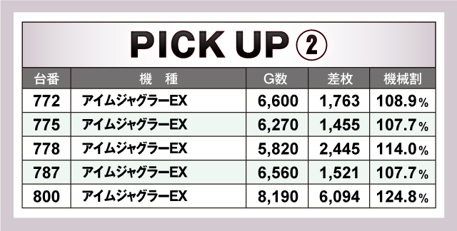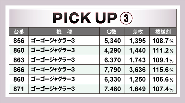 続いては、当日とくに好調だったジャグラーシリーズ3機種を紹介。ピックアップすべてが+1,000枚以上のプラスで、それぞれピックアップ機種の平均差枚は、「マイジャグラーV」は+1,479枚、「アイムジャグラーEX」は+2,656枚、「ゴーゴージャグラー3」は+1,852枚と絶好調! しっかり回されている台が多かったことからも、これらジャグラーシリーズのベースはかなり高かったようだ!
