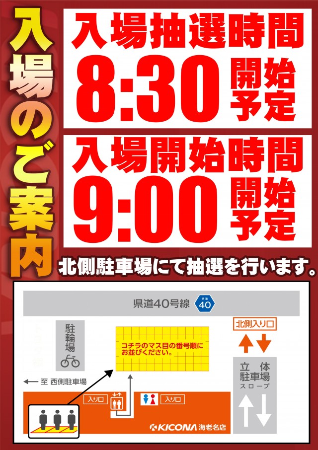 8時30分までに立体駐車場側入り口にお越しいただいたお客様を対象に入場抽選をさせて頂きます。 |
