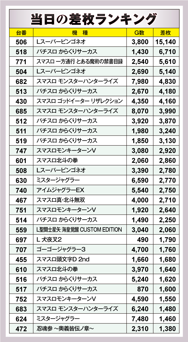 全体差枚トップ30を見ると、今回は『Lスーパービンゴネオ』から万枚OVERが発生! 前回の差枚数を大きく上回る15,000枚OVERで注目を集める存在となっていた。さらに『パチスロ からくりサーカス』からは6,000枚OVER、『スマスロ 一方通行 とある魔術の禁書目録』からも5,000枚OVERと大台突破台が出現。ホール全体で熱気が渦巻く状況に、訪れた取材班も驚くばかりであった。