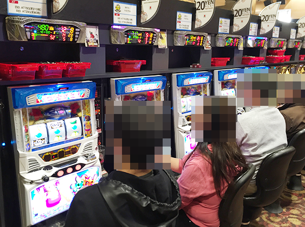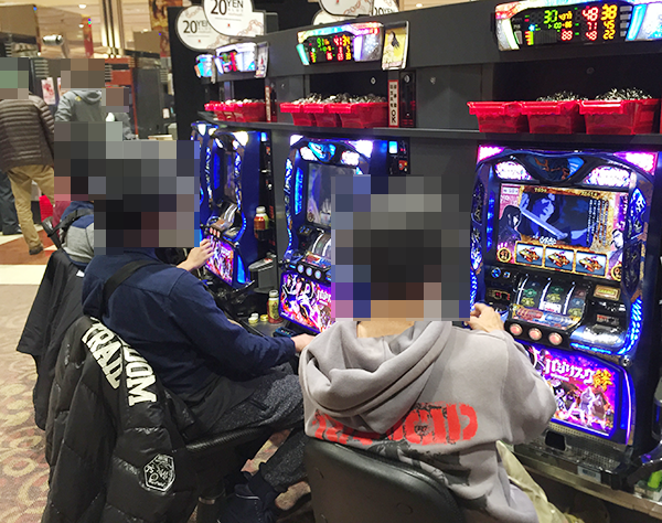 15時を過ぎた頃の20円パチスロにて、プレイヤーの視線を集めていたのは「バジリスク~甲賀忍法帖~絆」や「パチスロ北斗の拳 強敵」といったAT機。手腕を発揮しているプレイヤーも多く、満足度の高い空間なのだと強く思った。