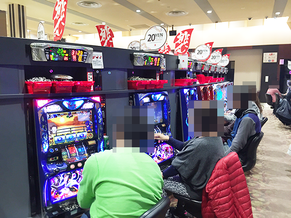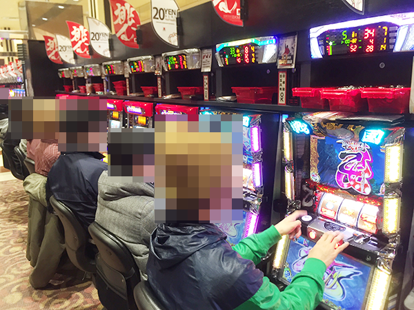 開店後のプレイヤーたちは、20円パチスロの「バジリスク~甲賀忍法帖~絆」や「パチスロ北斗の拳 強敵」などに向かっていた。