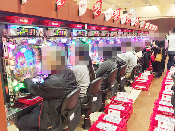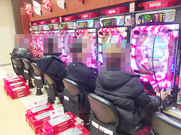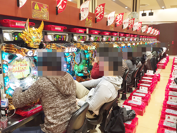 朝から人気のあった4円パチンコの「CR牙狼 魔戒ノ花」や「CR真・花の慶次」は、午後になってもほぼ満席状態。