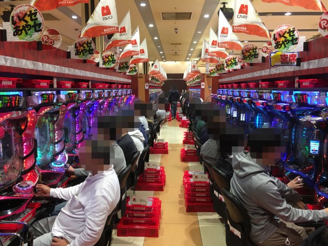 20円パチスロをみてみると、「バジリスク~甲賀忍法帖~絆」や「押忍!サラリーマン番長」などに、機種のポテンシャルを引き出しているといったプレイヤーを確認。シマ全体に華やかな光景が広がっていた。