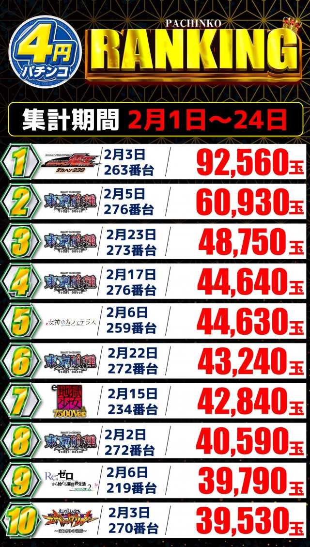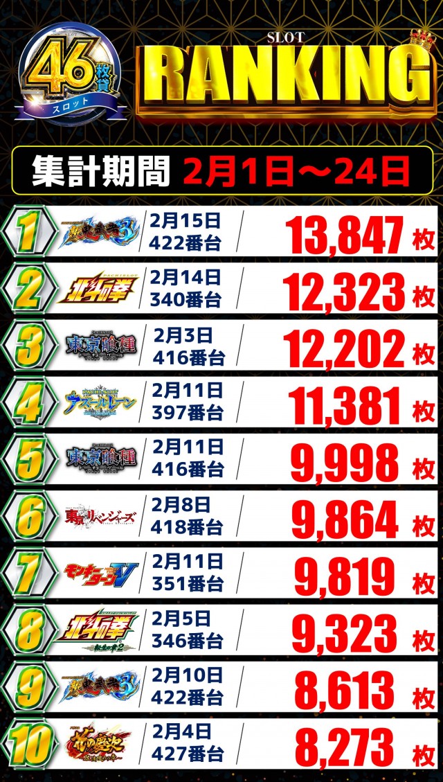 1位 2月21日(土) 2位 2月22日(日) 3位 2月23日(月)