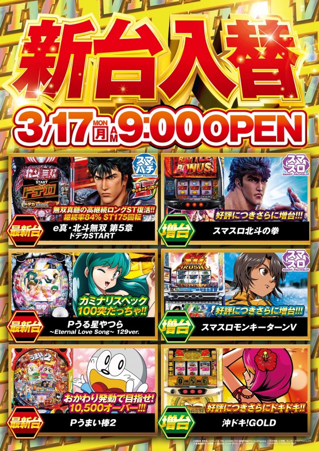明日☆新台入替☆JNアルファ☆全店一斉9時開店!!