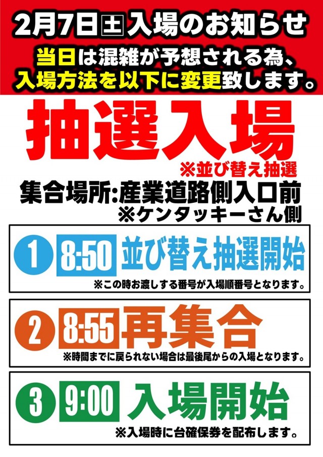 明日1月24日【土】抽選入場(8:50)まいったちゃん来店